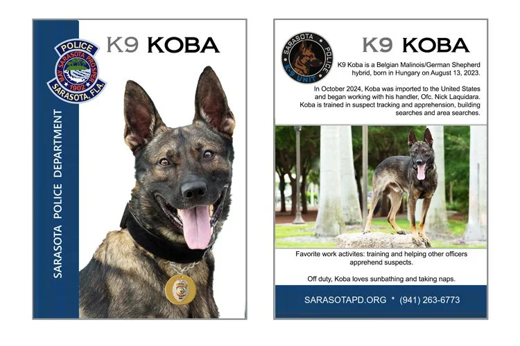 I’m happy to have been photographing our neighboring agency and often K9 training partners, Sarasota PD, for 6+ years. We used their PD logo on the front of the cards, and added their K9 unit logo on the back.